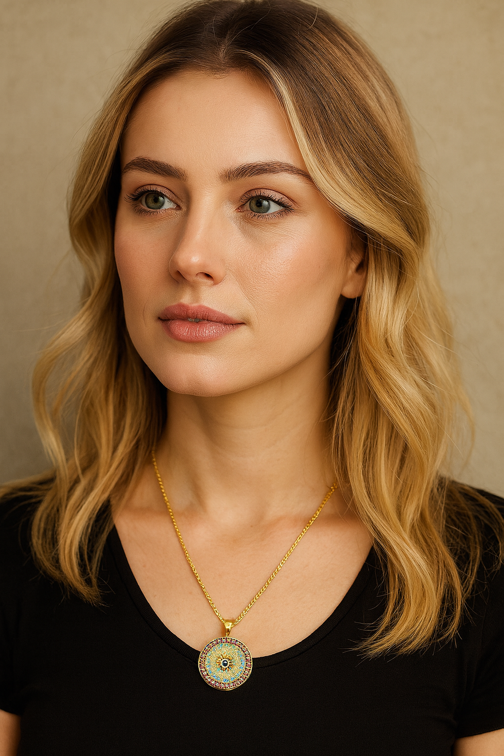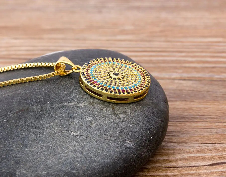 Turkish Evil Eye Pendant Necklace for Women – Round Micro Pave CZ Copper Chain Jewellery Gift